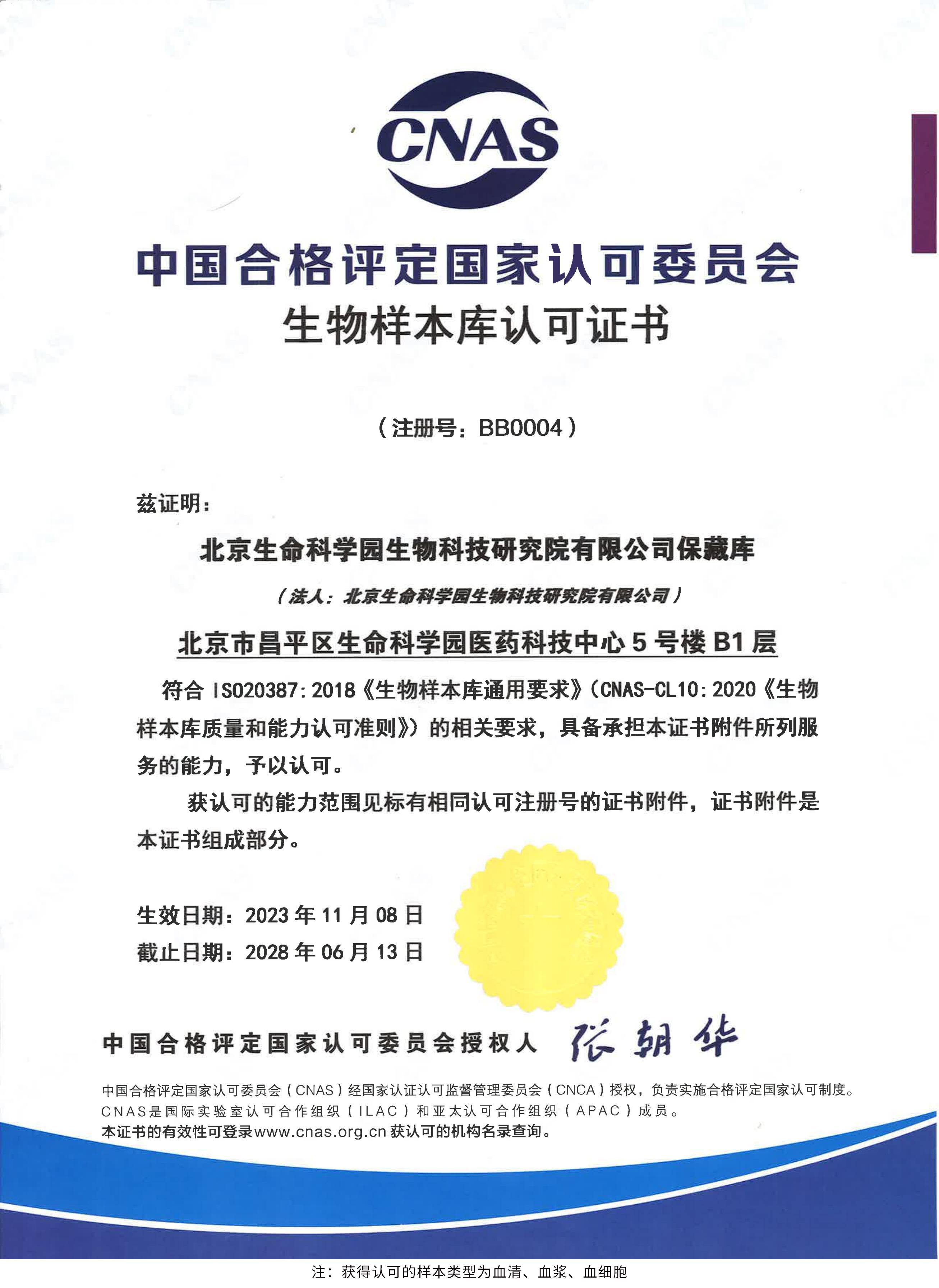 北京生命科學園生物科技研究院(以下簡稱“北京生物樣本資源庫”)(Biobank of Life Science Park,簡寫“BoLSP”)是一家由北京市科委和中關村生命科學園共同支持設立的第三方生物樣本庫公共服務平臺,秉承北京重大疾病臨床數據和樣本資源庫(以下簡稱“北京庫”)(Beijing Biobank of Clinical Resources,BBCR)十余年的發(fā)展成果,聚合眾多臨床樣本專家的專業共識,致力于在生命科學、生物醫藥研究領域發(fā)揮銜接樣本資源持有者與研究者的橋梁作用,解決生物樣本資源開發(fā)上下游信息不對稱、資源共享困難等問題。研究院在北京中關村生命科學園昌平園區建立了2000㎡生物樣本庫,最大存儲規(guī)模達1000萬份。研究院遵循CNAS-CL10:2020《生物樣本庫質量和能力認可準則》,同時結合北京庫過去十年的工作經驗與教訓,建立了一套完善的生物樣本保藏質量管理體系,從人、機、料、法、環(huán)、控多個角度,實現生物樣本保藏過程的全面質量控制,先后獲得國家科技部頒發(fā)的人類遺傳資源保藏行政許可證書和中國合格評定國家認可委員會(China National Accreditation Service for Conformity Assessment,CNAS)頒發(fā)的“CNAS認可證書”。